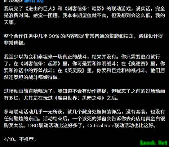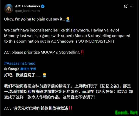 与此同时还有玩家对《进击的巨人》的联动表示不满:“完全是在浪费时间。整个联动任务中几乎90%的内容都是非常普通的攀爬和摆荡,路线设计也很糟糕。”还有玩家指出:““我们不能再接受这种不一致了。记忆之谷上周发布,其动作捕捉和叙事水准都很棒,而《AC影》这次的扩展简直是灾难,完全不一致。”