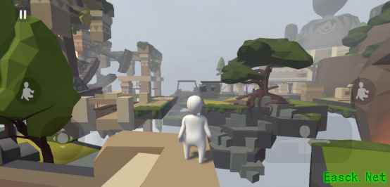初见《人类跌落梦境》的画面,我甚至以为是人物和场景材质没有加载完毕。并不能称之为精致的场景建模,白白净净的人物身体没有一点其他的贴图。操纵人物行走时,人物好似没有筋骨,一步一斜,歪歪扭扭,动作夸张,时常不经意间就做出令人笑喷的滑稽动作,显得鬼畜又可爱。