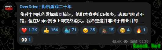 俄罗斯Spirit战队星探、知名业内爆料人OverDrive在社交媒体上发表犀利点评:“中国战队令人费解——整个赛季他们参赛频繁且表现可圈可点,却在Major舞台上瞬间蒸发。但愿这背后没有‘商业运作’的阴影。”这条动态迅速引发热议,不少玩家联想到近期亚洲赛区爆出的假赛丑闻。