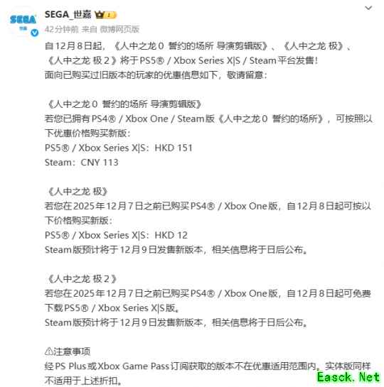 · 对于已拥有原版的玩家,官方提供了升级路径。在截止时间前购买原版的用户,可以优惠价升级至《如龙0:导演剪辑版》数字版。