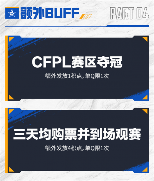 如果您对多款道具都情有独钟,不妨选择一条“捷径”:购买全部三个比赛日的门票,保持全勤记录,即可额外获得4个积点。若CFPL赛区队伍最终夺冠,还将额外追加5个积点,累计可直接兑换赤芒蝶刃-冠军赤芒等珍稀奖励,机会不容错过!