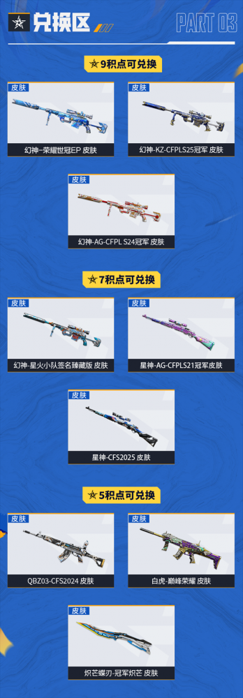 观赛同时,CFer还可通过积累积点兑换多重好礼。积点可兑换包括幻神-荣耀世冠EP在内的三大战队冠军皮肤,性价比极高。