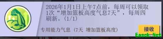 活动期间每周可以领取专用能力气息(7天增加篮板高度),让各位玩家的角色更加强力!