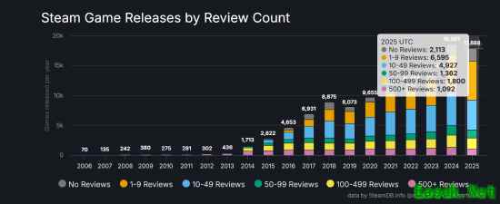 根据SteamDB数据统计,我们可以了解到2006年以来 Steam 平台每年发行的游戏数量及其收到的用户评测数量分布。