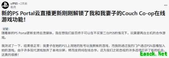 Reddit网友Tsasuki发帖称,PS5玩家可在主机下载游戏,让玩伴通过PSN账号登录获取游玩权限。然后,拥有PS Plus三档会员的玩家即可在PS Portal上云端串流同一款游戏。