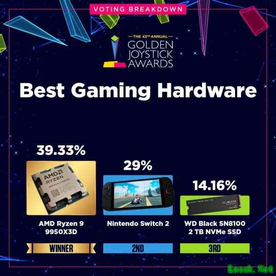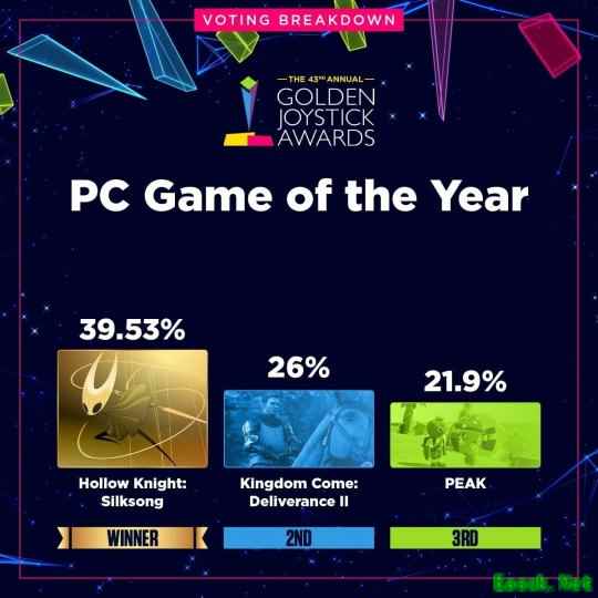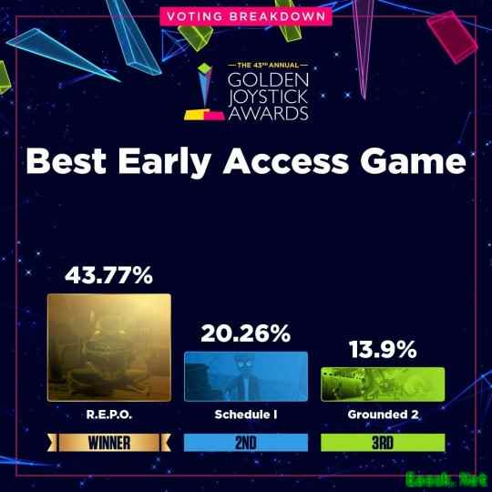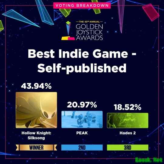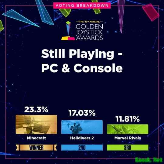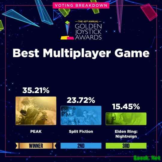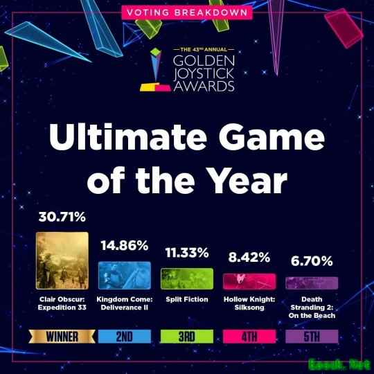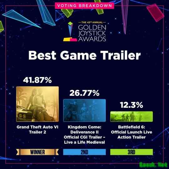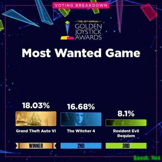 数据显示,部分获奖作品以绝对优势胜出,而另一些奖项的角逐则持续到最后一刻。最受热议的结果之一来自“最受期待游戏”类别——《GTA6》与《巫师4》的得票率仅相差不到2%,分别为18.03%和16.68%。据主办方透露,由于某个阶段两款游戏的票数曾急剧接近,团队甚至已开始为可能出现反转结局做准备。