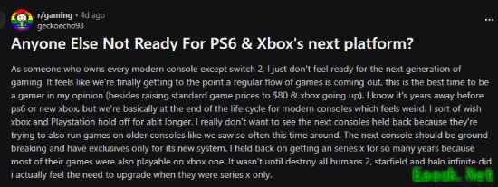 然而,随着新主机话题愈发热烈,玩家社区的态度却显现出明显分歧。近日,Reddit上一篇讨论帖引发热议——不少玩家明确表示,他们完全不愿意这么快掏钱换新机,认为现世代主机的潜力仍远未被完全发挥,距离“该更新”的时机还差得远。