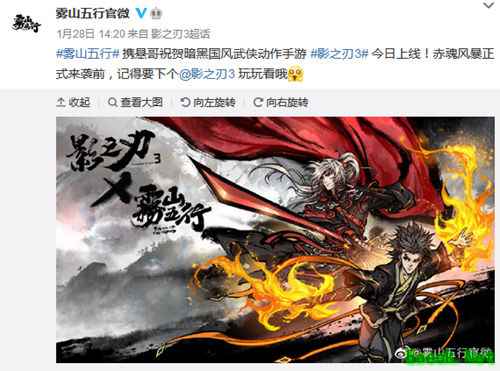 早在1月28日《影之刃3》公测上线前,《雾山五行》官博已经与《影之刃3》官博“眉来眼去”,且在1月28日《影之刃3》公测当天,《雾山五行》官博发布了包含双方主人公的贺图,玩家们纷纷猜测4个联动合作中的一个应该就是与《雾山五行》的合作。