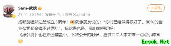 11月30日,国产动作游戏《猿公剑》制作人@Sam-武侠在个人微博账号上发文庆祝团队剑猫熊已成立三周年,并表示游戏会在下次公开时给玩家带来惊喜。