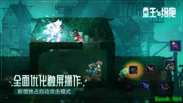 短而爽快的单张地图通关时间和刷刷刷要素,恰好与手机游戏“随时随地游玩”的特性相契合。同时,《重生细胞》引入自动攻击模式,解决了手机触屏操作和动作游戏需要精细操作的矛盾,玩家只需熟悉武器特性就可以轻松打出“神操作”。在氛围感强烈的游戏音乐下,穿梭于极具个性的像素风地牢世界之中:是挥舞巨镰战斧一路血雨腥风,精准盾反极限操作,还是利用寒冰手雷和箭塔之流的道具让boss“生无可恋”?一切,都由玩家来决定。