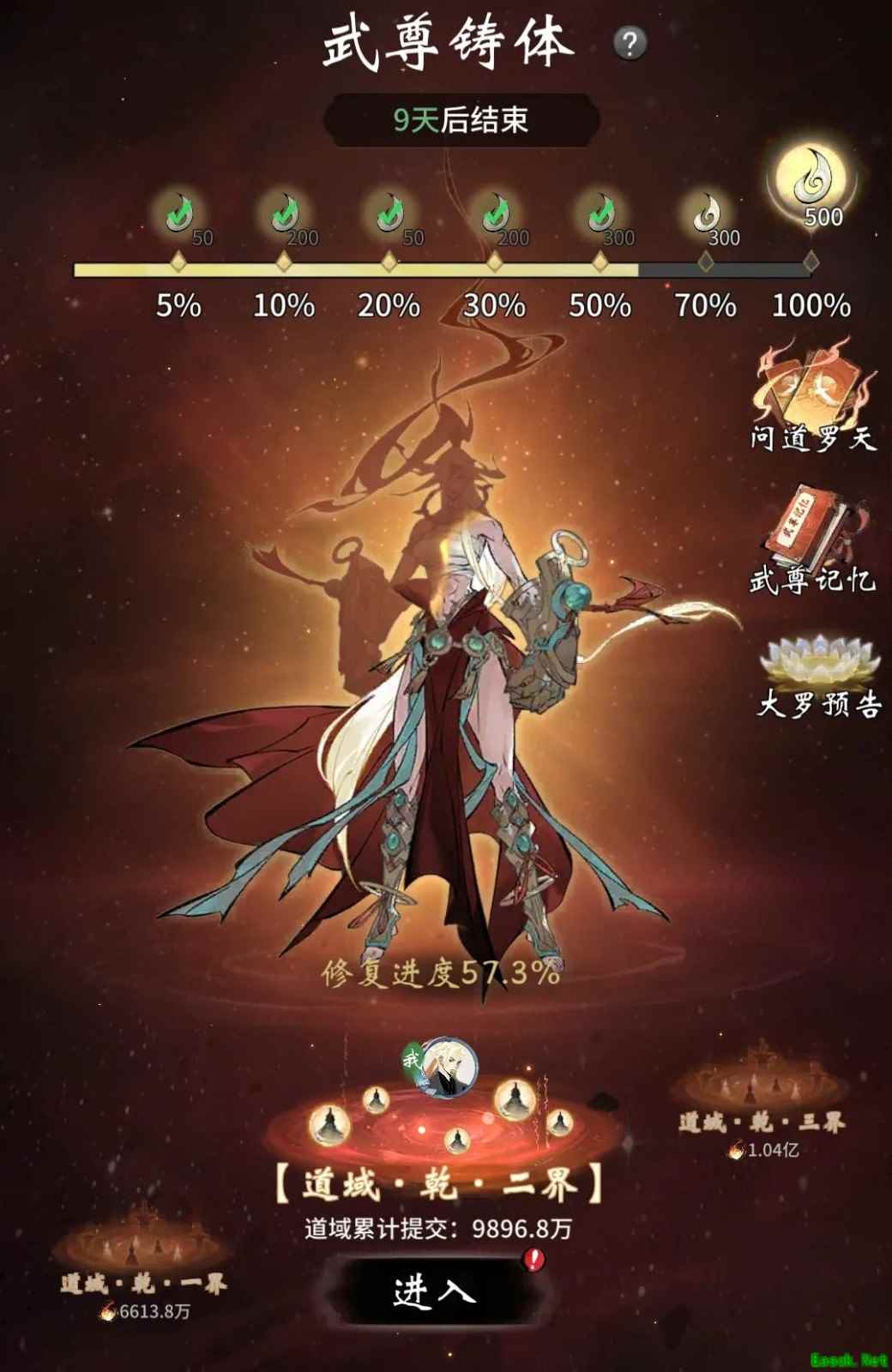 此外,达到一定修复进度时,玩家可领取大量机缘奖励,并激活“武尊福泽”,提升获取铸体精魄的效率。