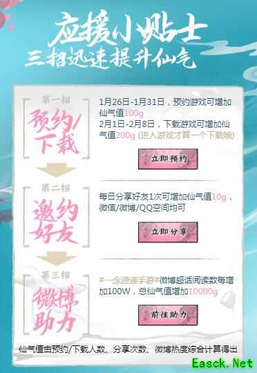 一念逍遥手游的祖儿小师妹应援活动在火热进行中,1月26日-2月26日期间,玩家们都可以通过预约或下载游戏、分享好友或微博助力,为祖儿积累个人仙气值,提升更多全员仙气值,除了解锁上述物料外,还能陆续解锁抖音、微博资源等更多惊喜!