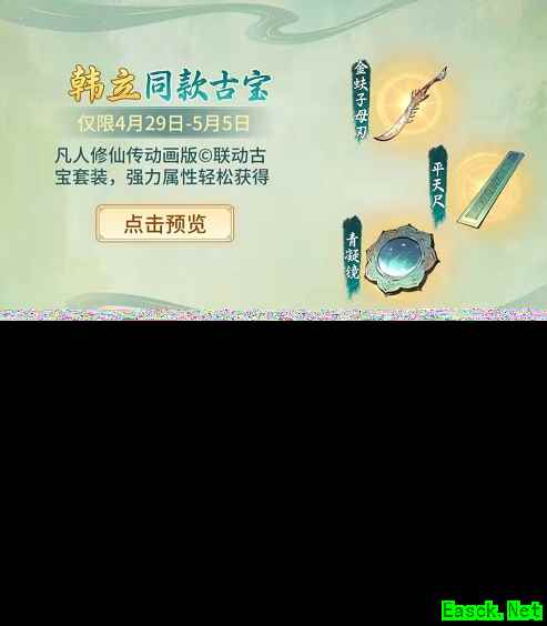 此次的联动内容除了有《凡人修仙传》作品内“赤色禁地”的新玩法、韩立同款古宝之外,玩家们还能够得到《凡人修仙传》动画韩立门派“黄枫谷”套装,化身黄枫谷修士除魔卫道,以及造化至宝新皮肤——掌天瓶!真实还原韩立寄身宗门,培养灵植、努力修炼的情景;还有签到、宝盘以及《凡人修仙传》知识问答等活动,以及上万机缘奖励,韩立也会在登录界面引领仙友们进入游戏,和好友厉飞雨于城镇中出现,与玩家一同探讨修仙之道。
