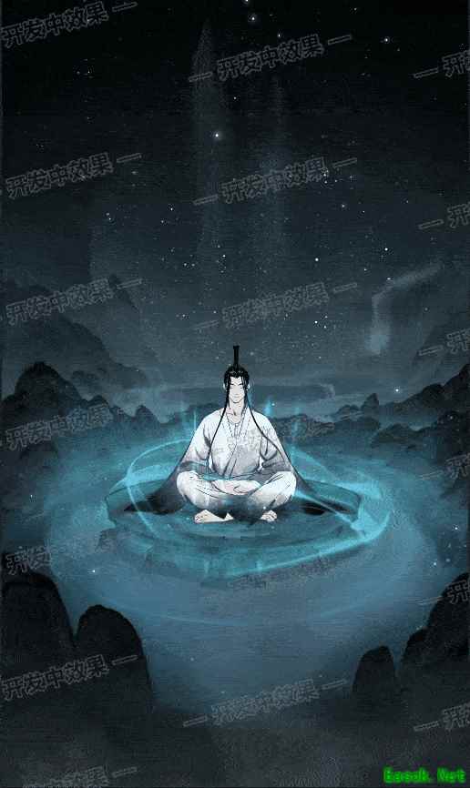 蓬莱海岛任仙人遨游,席地而坐屏气凝神,吸纳天地灵气,参悟大道玄机。流水潺潺,灵台高筑,呼应群山,自然和谐一体。