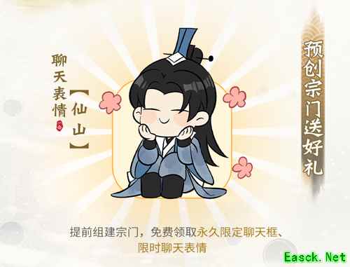 预创角成功后,符合条件者可预先创建宗门,锁下心仪宗门名号,其他玩家可以预约已预创的宗门,待30日新大区开放,则可领取永久聊天框“宗门之路”和限时仙山表情包奖励!
