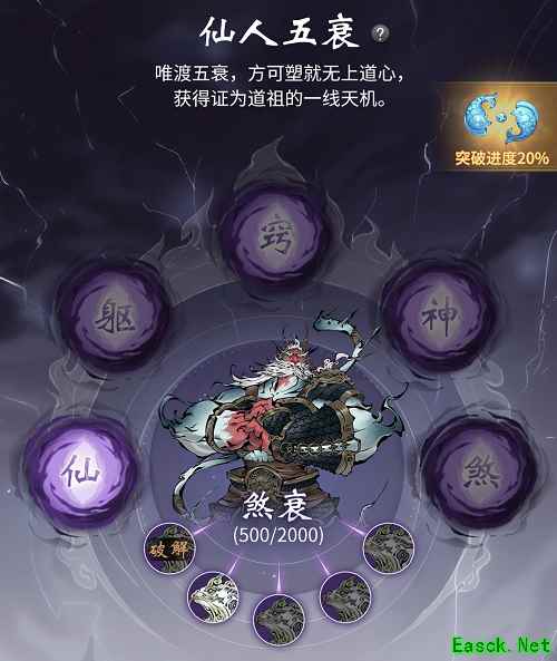 然而天道无常,对大道的渴求之下,内心异象丛生,魔影笼罩,“仙人五衰”便孕育而出。仙衰、躯衰、窍衰、神衰和煞衰为“大五衰”,每一大衰之内各有五个阶段,唤为“小五衰”,唯有参与心魔试炼,化解小衰,突破大衰,方可获得证为道祖的一线天机。若能守心静修,逐个击破,自得大道广阔,修为进益。