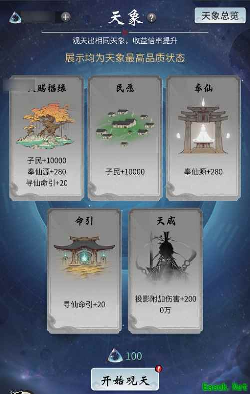 仙友可使用天象玉进行观天,获取民愿、奉仙、命引、天威、天赐福缘等天象,从而获得子民、奉仙源、寻仙命引、投影属性收益。当前仅开启白品天象,仙友可通过仙界秘境、秘境储物袋获得,新的天象玉获取方式则会在后续进行更新,还望仙友海涵。