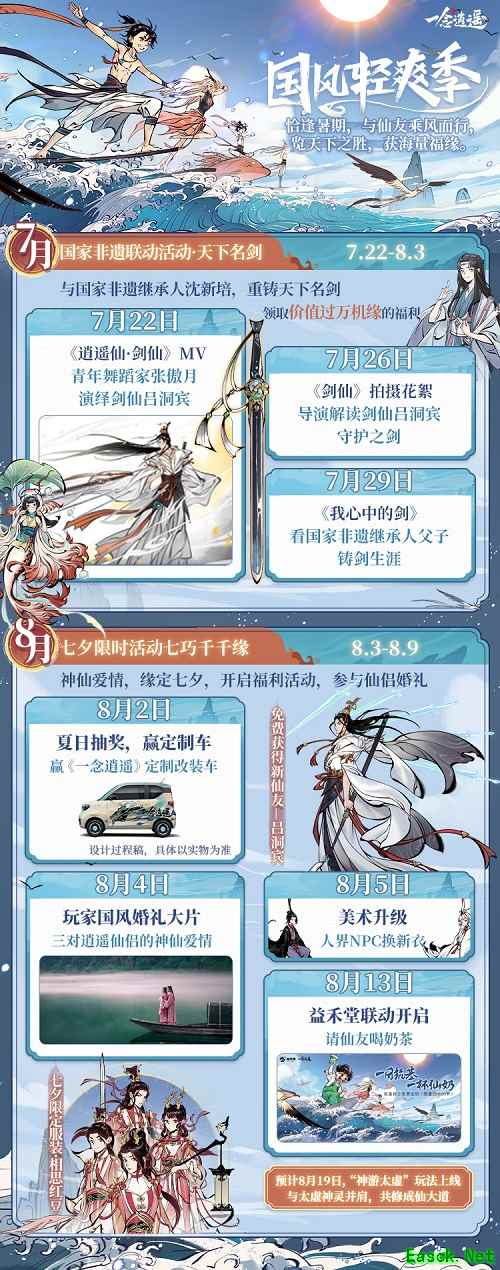 热情盛夏,逍遥修真界即将迎来这位真正的铸器大师。立即下载《一念逍遥》,与沈老师合作,寻古韵,解图纸,共铸天下名剑。沈老师亲手打造的“吕仙剑”,化身全新古宝,助力仙友修行!参与活动,重铸吕仙宝剑,获得仙友“吕洞宾”,与剑仙一起轻松修仙。还有抽奖送定制改装车等活动,等你参加!