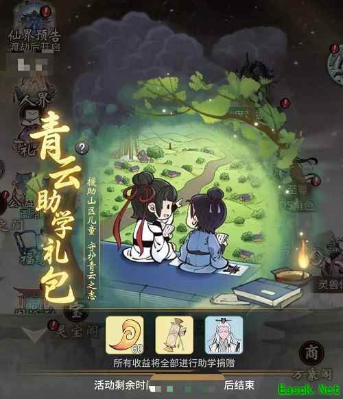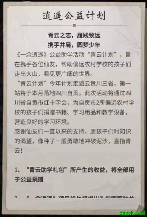 “青云助学礼包”所产生的收益,将全部用于公益捐赠,同时《一念逍遥》项目组也将捐出礼包同等收益金额,一并用于公益捐赠。“青云助学礼包”所产生的收益及官方捐赠金额的使用详情,后续将在《一念逍遥》官网进行公示,仙友也可通过【活动】-【逍遥公益】,跳转至公益专题页,查看公益活动详情。