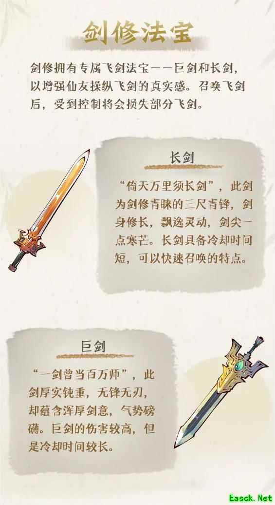 剑修拥有专属飞剑法宝-巨剑和长剑以增强玩家操纵飞剑的真实感。召唤飞剑后,受到控制将会损失部分飞剑。
