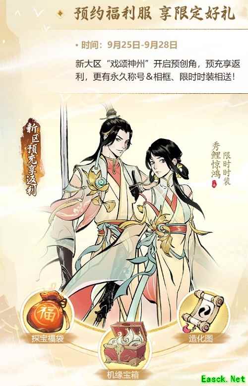 全新大区“戏颂神州”9月28日正式上线,即日开启预创角!本次主题服还有元婴挑战赛等活动,瓜分10万现金大奖,还有机会获得满时装角色号(无法返场的服装除外,详见活动规则)。各位记得早点创角,争取以最快速度开启修炼!