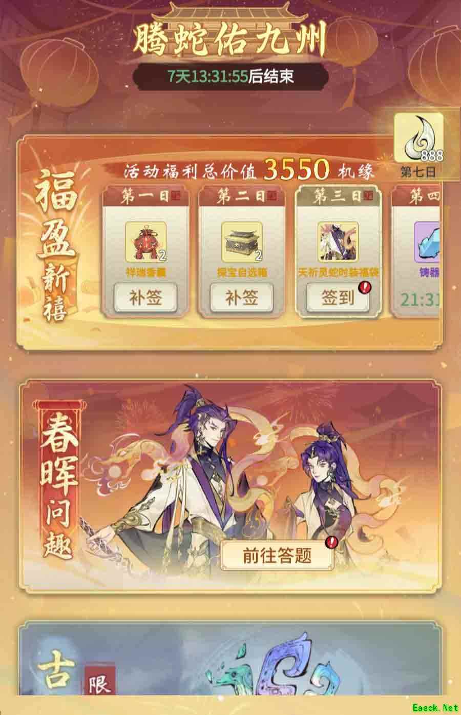 1月27日~2月5日,“腾蛇佑九州”活动全服开放,活动主体内容包含签到答题、新岁绘图、新春趣旅、兑换宝库、乙巳年兽、弈趣仙棋、口令红包等。可免费领取探宝令、888机缘等好礼;有机会获取限定时装&灵画天祈灵蛇、幻化白前辈等奖励;积攒春响竹,可兑换造化玉等珍稀宝物。