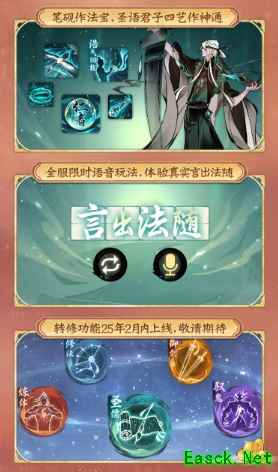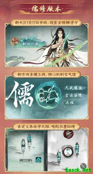 四周年新大区【儒道浩然】将于2025年1月17日开放,送至宝锦鲤密令和限时探宝100抽!新修炼方向“圣儒”将于17日同步上线,可体验全新文气机制和本命字大招玩法,还有限时言出法随活动,同时转修功能将于25年2月内上线,无负担体验新职业,轻松修炼!