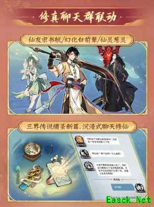 修聊联动2025年1月17日上线,和宋书航、白尊者、葱娘一起共庆四周年!三界传说联动儒圣新篇,体验新剧情即可免费获取紫品联动时装、道具,橙品古宝等福利,还有更多外观、表情包即将上线,欢迎加入修仙一号群,一起欢笑修仙!