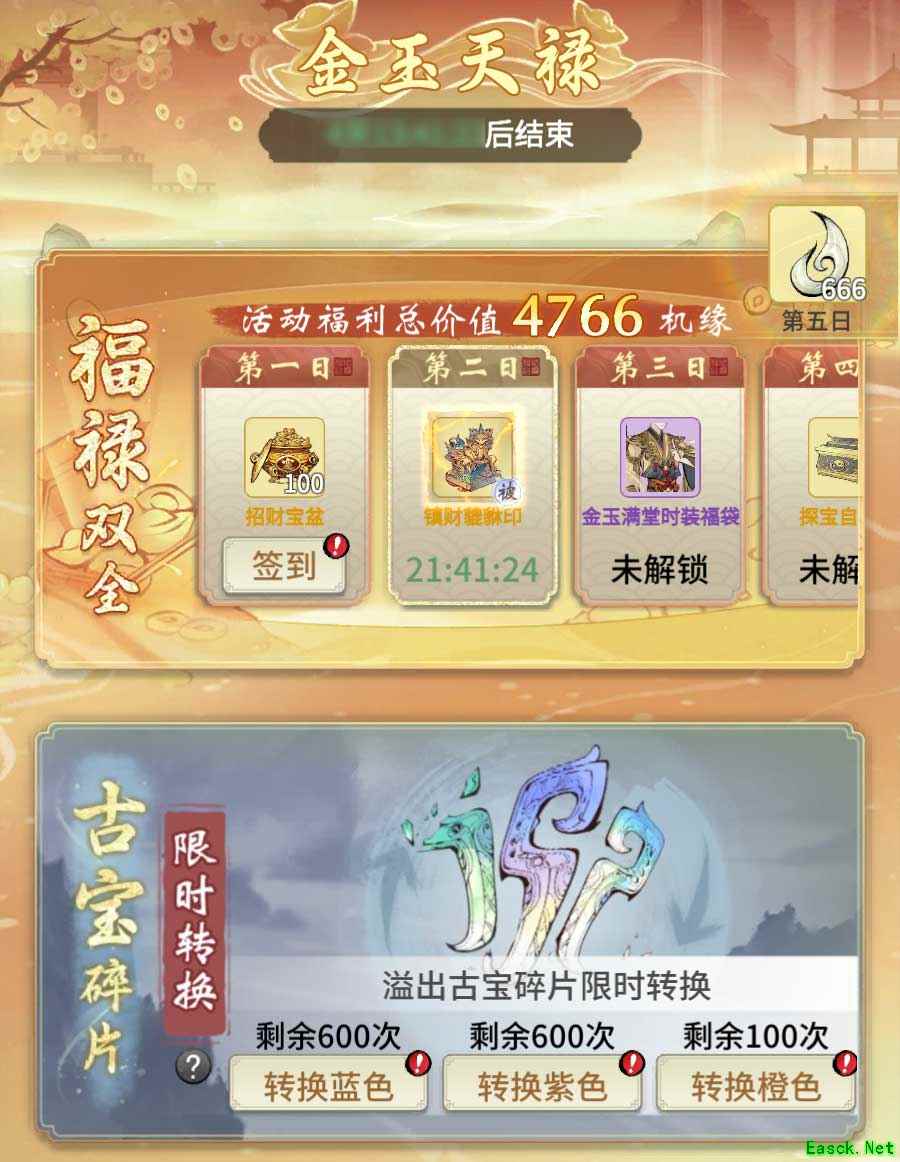 每日签到可免费领古宝、时装福袋等好礼,古宝碎片转换限时开启;解锁拼图,免费拿下限定眉眼与探宝令;转动宝盘,获取限定时装及灵画;活动中积攒的金元宝,可在宝库兑换福灵币、造化玉等珍稀宝物。