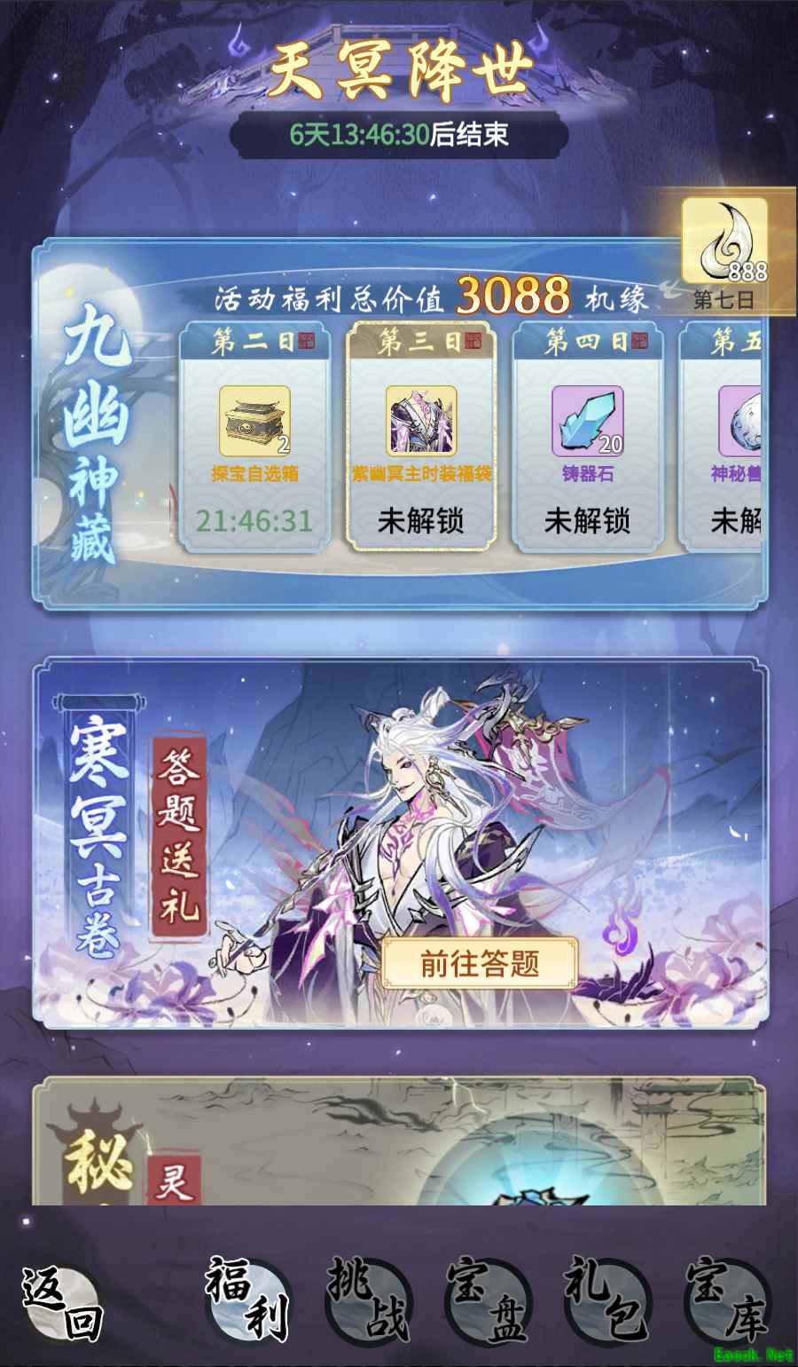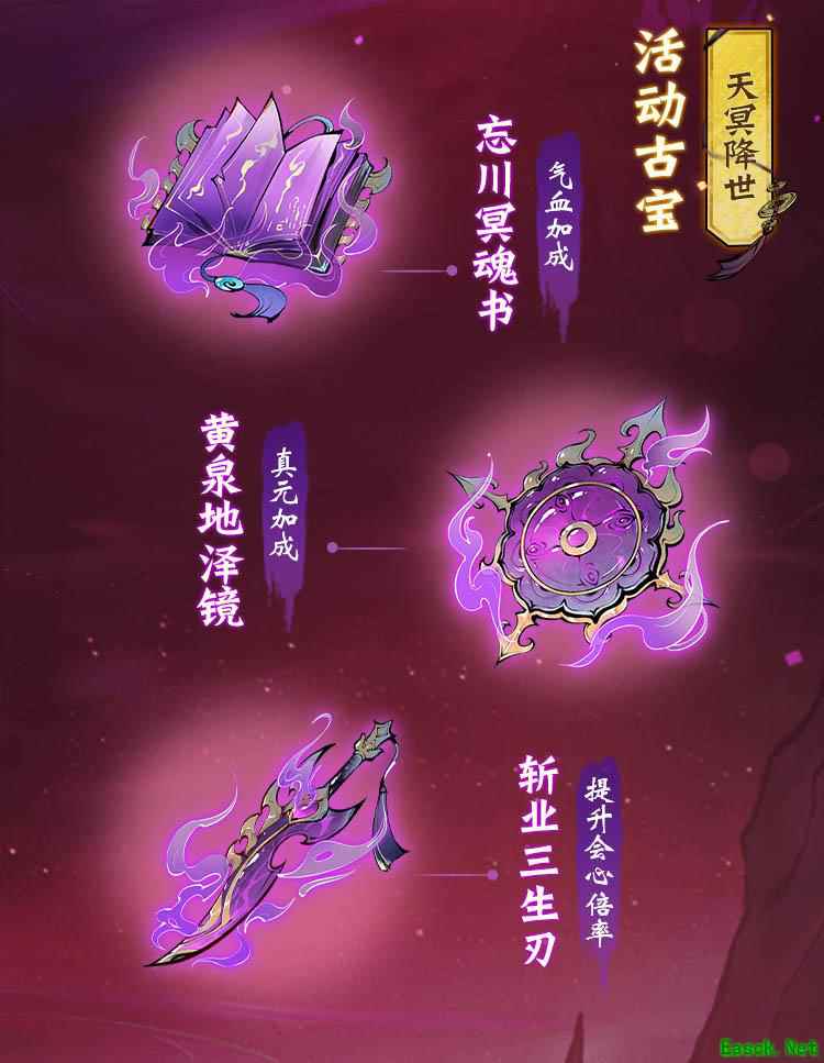 活动古宝套装“天冥降世”上线,集齐可助实力提升。古宝可通过登录领奖、万鬼冥渊等活动免费获取,转动浮幽玄盘亦可获得更多古宝碎片。