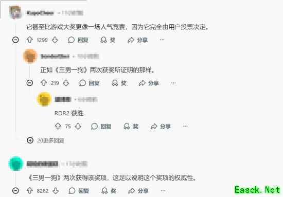 下方评论区有人吐槽:“比起游戏大奖,这更像是人气竞赛,因为它完全由用户投票决定!”“《三男一狗》两次获奖,这足以说明这个奖项的权威性了!”