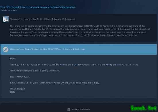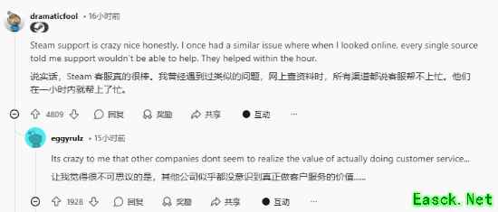 该玩家对客服的帮助表示了由衷的感谢,并在Reddit上发帖赞扬Steam提供了超出预期的服务。