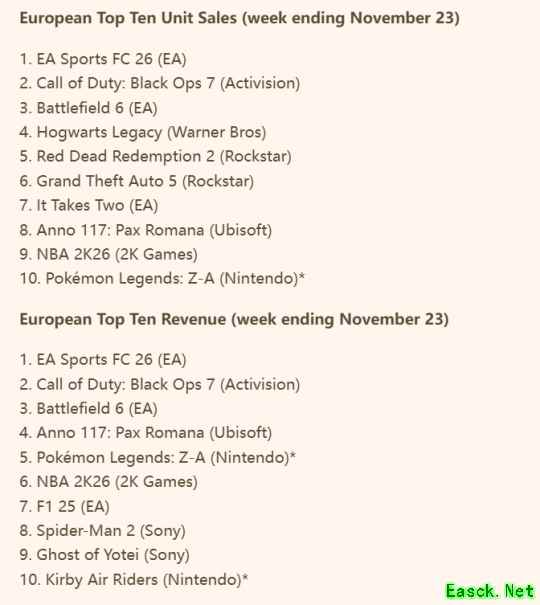 《EA Sports FC 26》本周重新夺回了销量榜首位置,《战地6》则跃升至第三位。《黑色行动7》自首发以来,其欧洲销量较前作已下降超过50%,此次排名的下滑是这一疲软态势的延续,与此同时,游戏本身所获评价也较为平庸,未能有效提高销量。