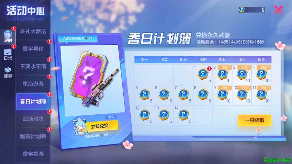 4月11日至4月24日,每日登录签到完成春日计划,可兑换A级枪械皮肤自选卡,含新皮肤“春晓”,快快行动起来吧!