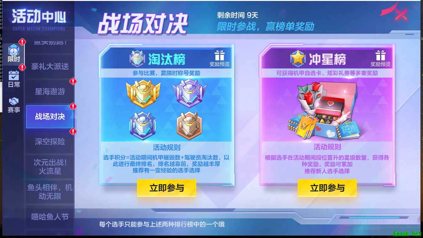 活动开启后,选手可在淘汰榜和冲星榜中选择一个榜单参与: