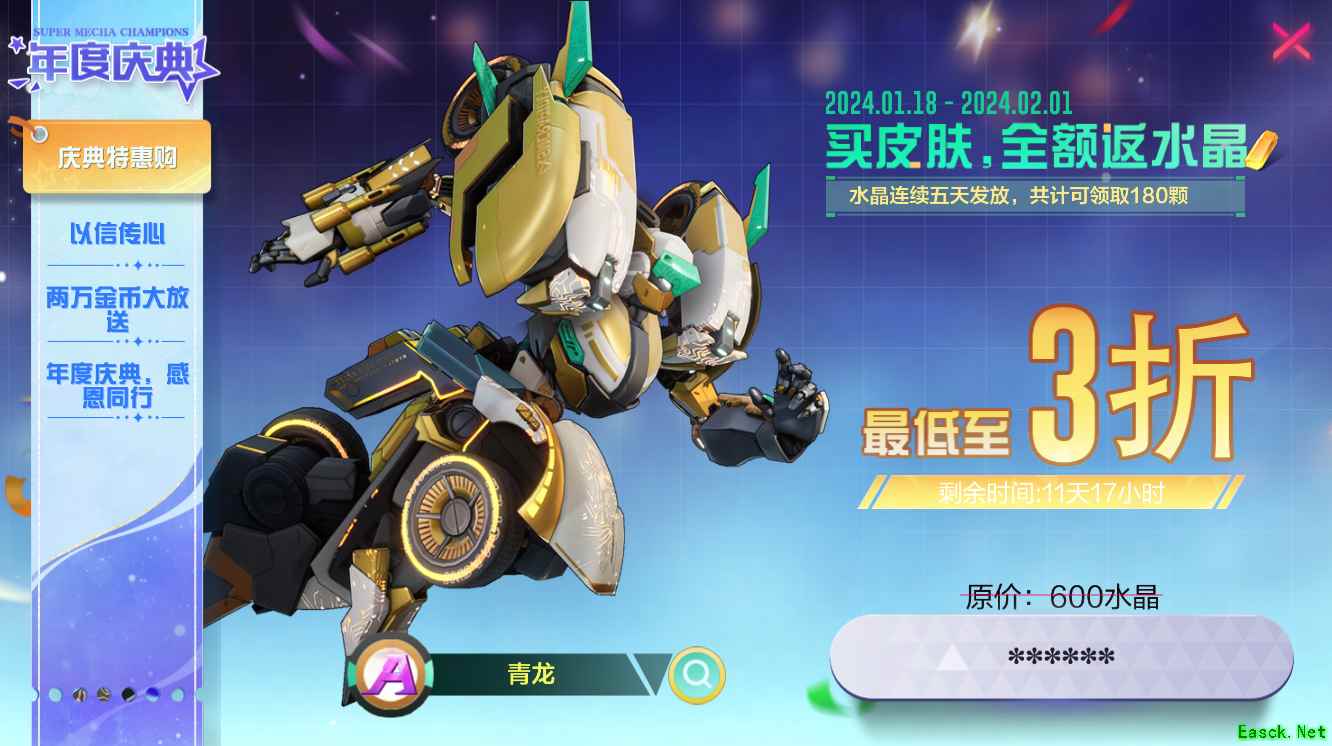 c.庆典特惠购:巡游者A级皮肤“青龙”限时抢购,每日登录即可全额领取返利水晶!
