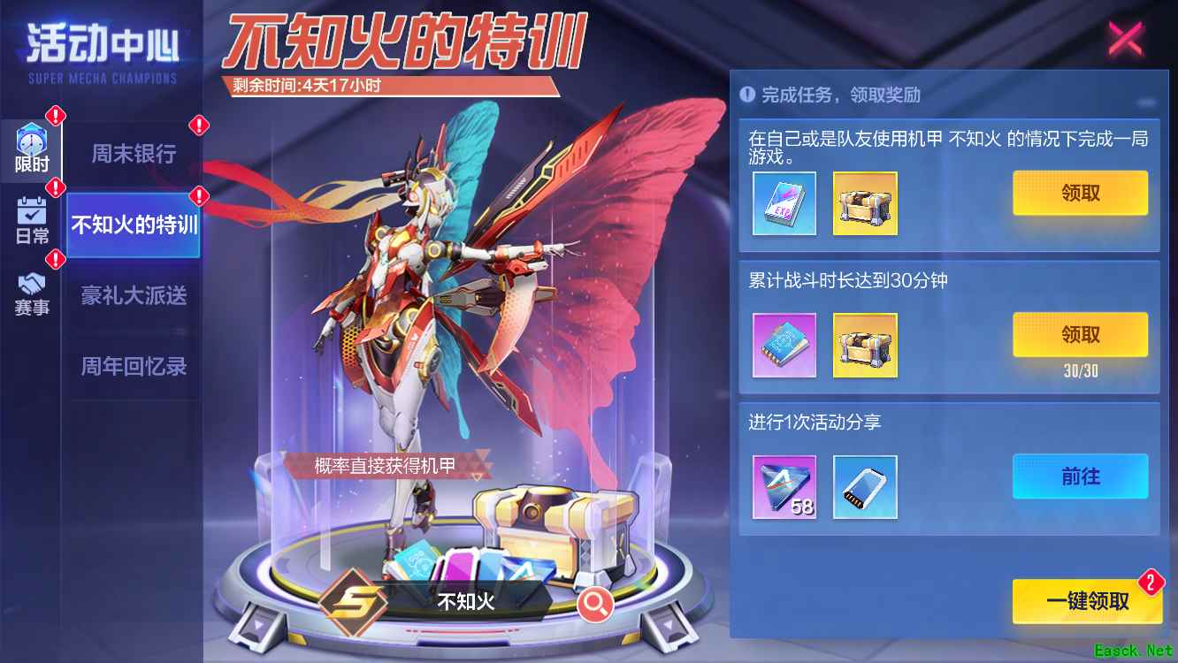 1月18日-1月25日,完成任务即可领取机甲上新礼盒,概率直接获得新机甲不知火!