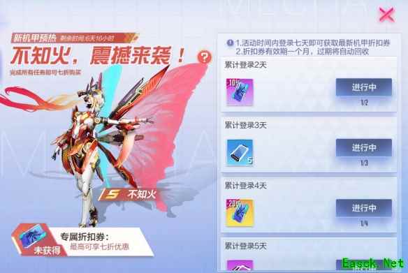 新机甲即将上线!1月11日至1月18日,每日登录领取好礼最高可获得不知火七折购买折扣券!