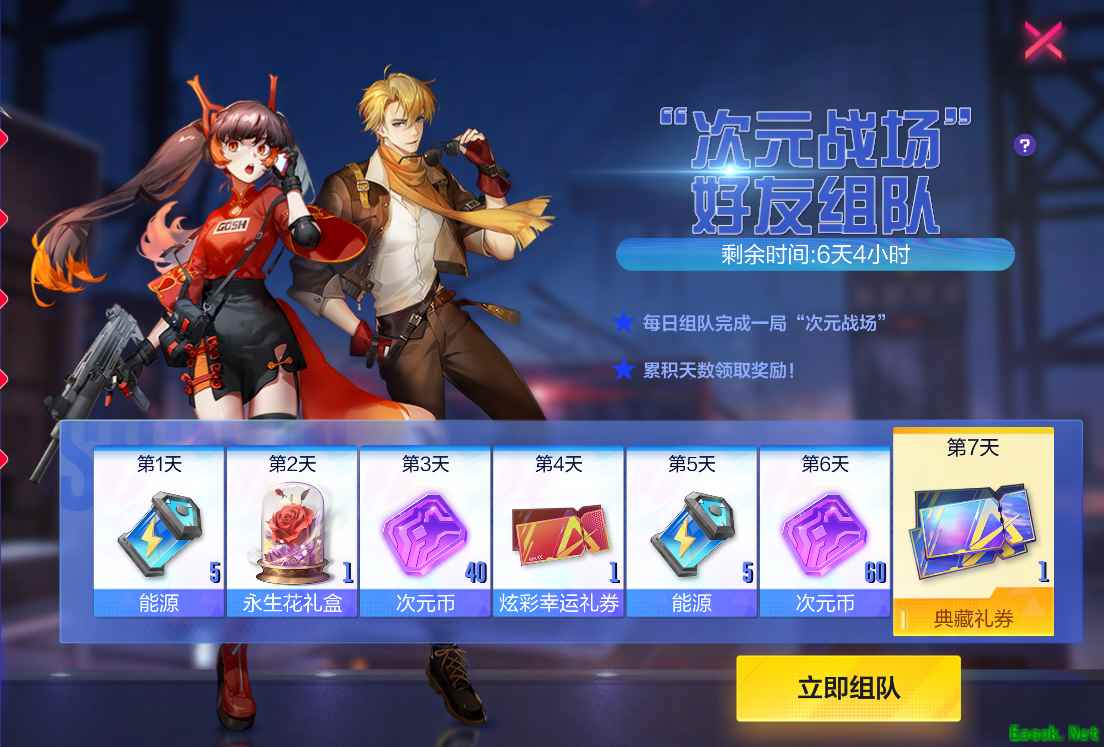 与好友组队每日参加一局“次元战场”,即可获得100次元币和10能源!