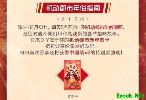 当然,活动期间还有各种隐藏福利等待各位选手自行发掘!并且,隐藏福利的力度同样十分强大,玩家不仅可以DIY专属于自己的新年贺卡,在收获特别奖励——中国结的同时为亲朋好友送出祝福,还可以通过春节特别签到活动,每日领取专属惊喜,福利满满不容错过!