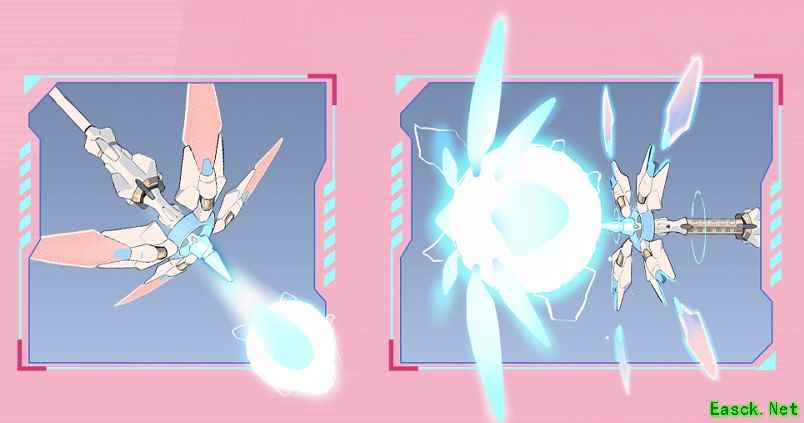 主武器“光弹射击”可以发射具有优秀的射速和弹道速度的光弹,同时还会对被副武器攻击标记的敌方机甲进行一定程度的追踪,在中远距离可以获得让人满意的命中率。