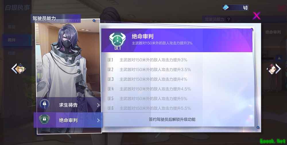 游戏中每位驾驶员都拥有两个驾驶员能力,一个作为人物天赋,为驾驶员提供加成。另一个为机甲专精,可以为机甲提供加成。