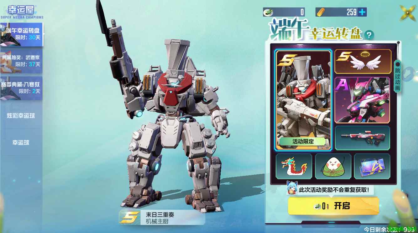 备受玩家喜爱的重装型机甲末日三重奏也迎来了S级外观“机械主厨”。端午活动期间,限时活动“端午幸运转盘”也将开始,不仅有末日三重奏S级外观“机械主厨”,还有仙女座A级外观“漂移之星”、乔安娜S级装饰“小天使”、脉冲步枪A级外观“掠空红鹰”! 为了感谢选手们的支持,所有选手都将获得免费参与该奖池一次的机会奥!又可以白嫖啦!