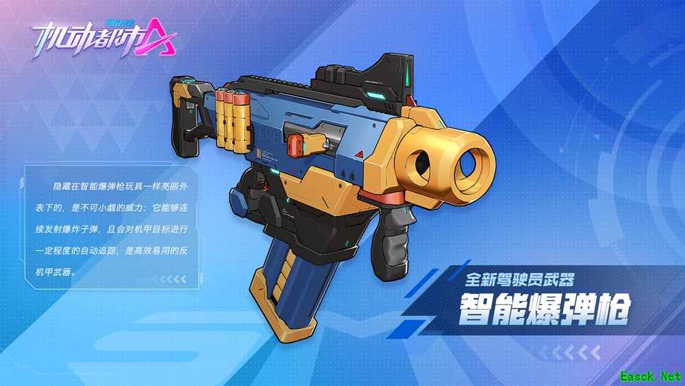 此外,全新驾驶员武器——智能爆弹枪也将加入战场,在它玩具一样可爱外表的下面是不可小觑的威力,它能够连续发射爆炸子弹,且会对机甲目标进行一定程度的自动追踪,是高效易用的反机甲武器。