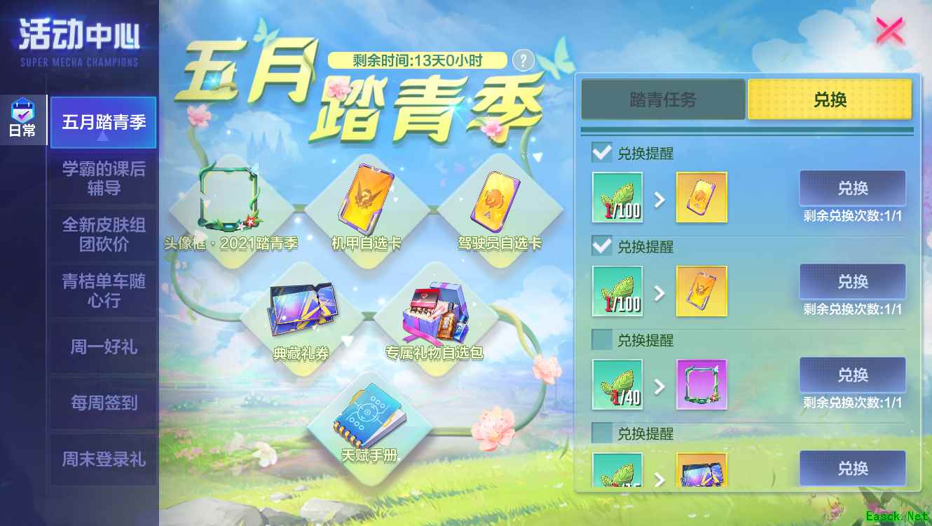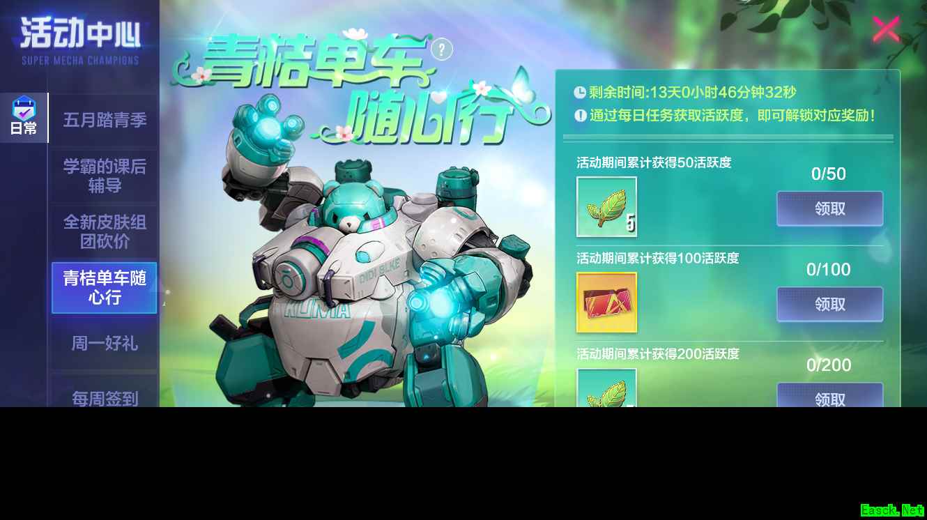 活动期间完成活动任务,收集绿意徽章,就可以免费兑换机甲和驾驶员。每日任务积累活跃度,达到指定数量后还可以免费解锁青桔单车联动皮肤——焦糖重炮?青桔!
