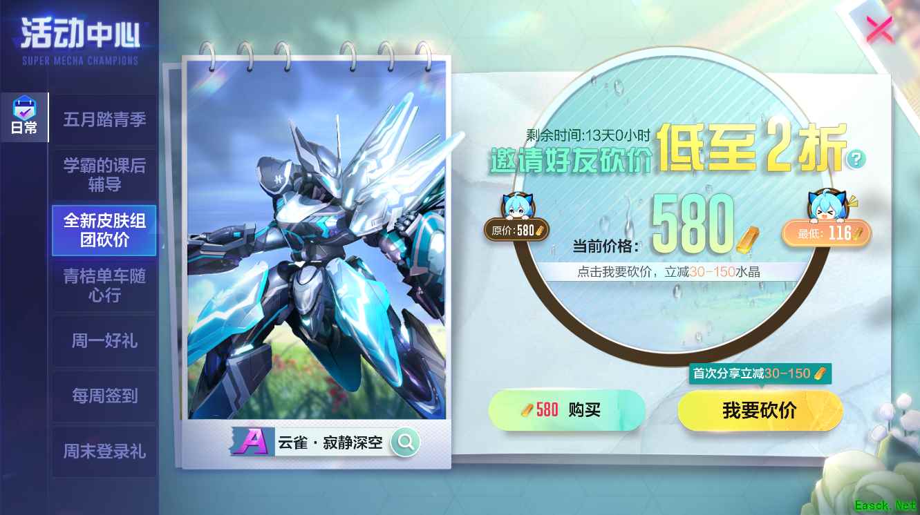 不仅如此,人气机甲云雀全新皮肤——“寂静深空”带着折扣福利也来了,活动期间邀请好友帮忙砍价,最低可享2折超值优惠。
