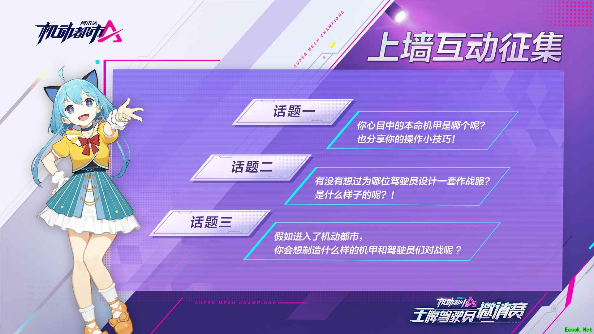 除了观看精英选手们的酷炫操作,亲爱的驾驶员们也能参与到赛事中来。即日起至4月22日中午11点,在机动都市阿尔法官方微信、微博和B站下,找到互动活动,参与【上墙互动征集】,评论区留下你的脑洞答案,就有机会上墙《王牌驾驶员邀请赛》直播间,更有全新推出的阿尔法积木周边送出!赶快行动吧!