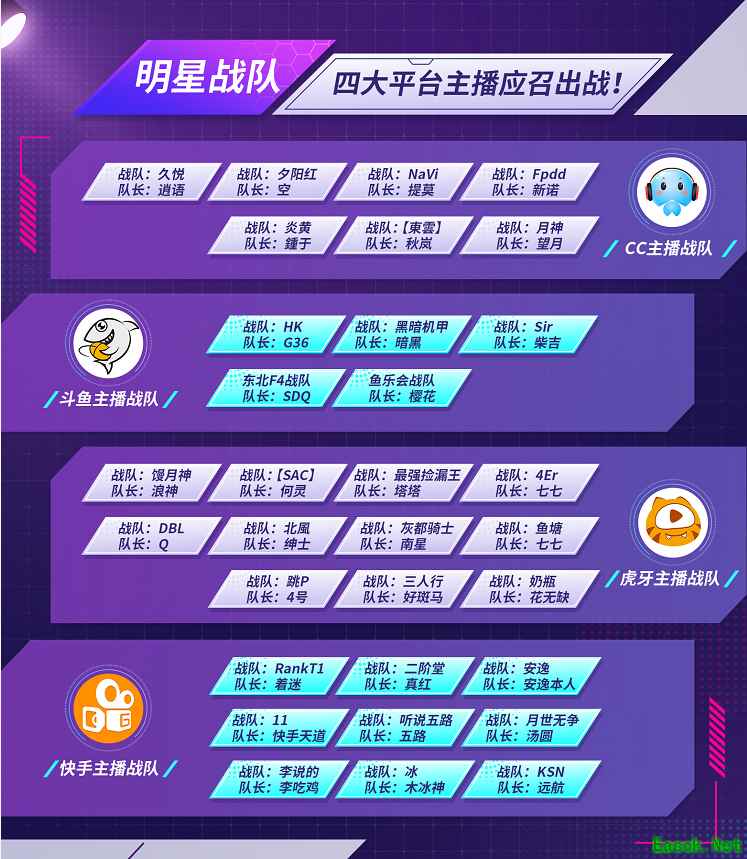 32支精英主播战队汇聚一堂,上演巅峰机甲大战!其中不乏国服最强机甲选手:来自快手主播着迷的末日三重奏、快手主播五路的审判之眼、快手主播汤圆的厄运光束、虎牙主播浪神的电幻先知、虎牙主播何灵的云雀、虎牙主播绅士的厄运光束、CC主播新诺的火流星和CC主播鍾于的渡鸦。更有人气主播远航和捡漏王塔塔狭路相逢,谁的焦糖重炮更胜一筹?32支精英战队巅峰“机”战,谁能成为最终赢家?让我们拭目以待!