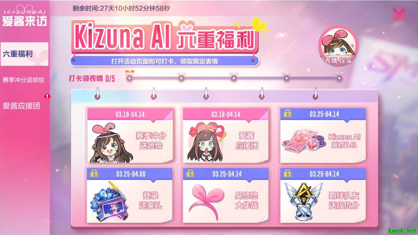 为了欢迎爱酱的到来,游戏内也准备了六大福利活动,3月18日,将率先更新“赛季冲分送喷绘”和“爱酱应援团”两个活动。选手们参赛战斗及累计登陆,达成任务目标,就可以领取爱酱联动限定的喷绘和表情包。