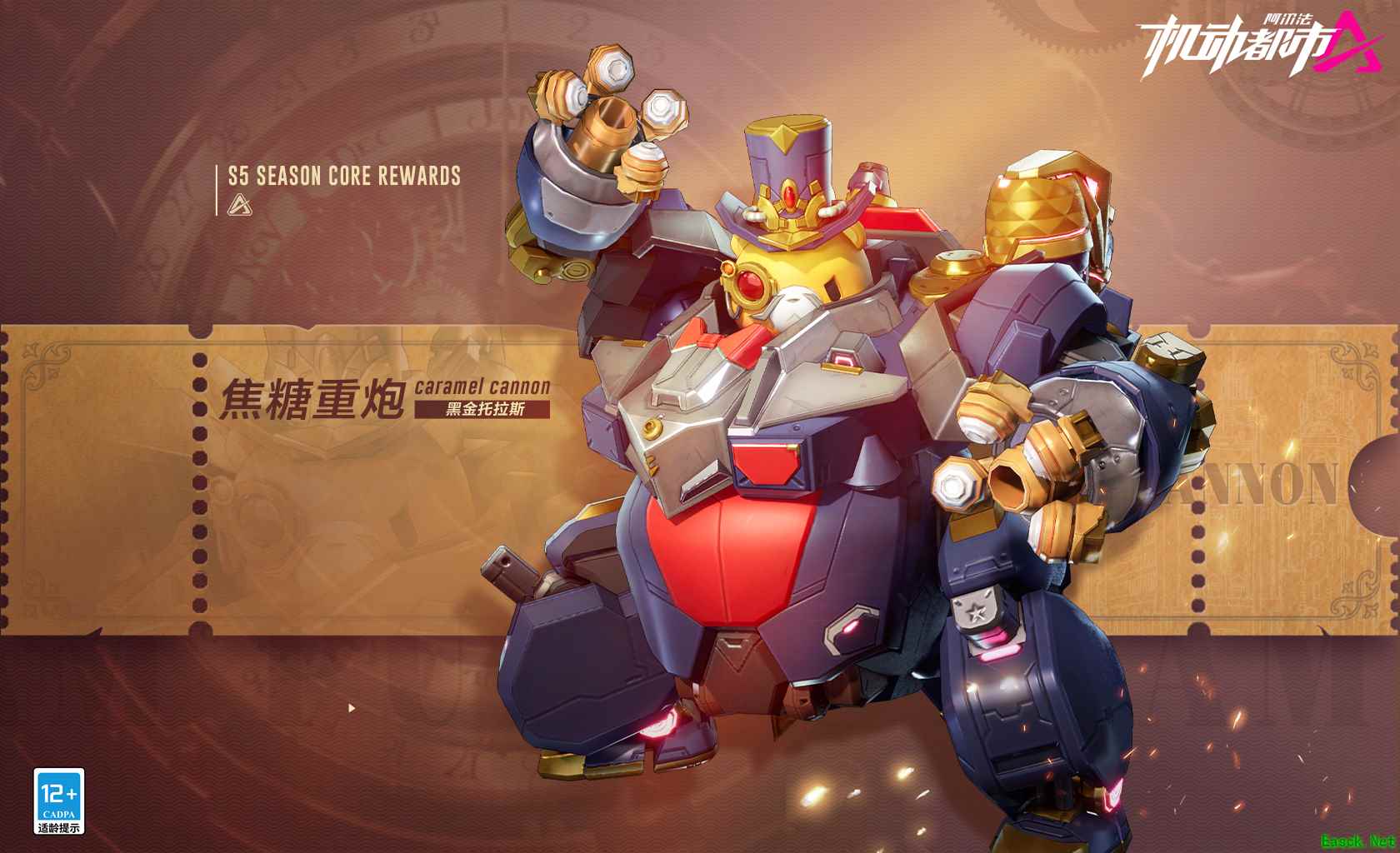 以“蒸汽航线”为主题的S5赛季开启后,赛季皮肤奖励也正式上线!高额伤害的重装机甲焦糖重炮将迎来S级外观“黑金托拉斯”。高高耸立的礼帽,复古的单边眼镜等蒸汽朋克元素的交织下,软萌的熊形态瞬间就化身成了一个睿智的绅士。但在下一秒,他又会马上变身成一尊泛着寒光的巨炮,唯有炮台上的那顶礼帽,似乎还在诉说着焦糖内心的某种坚持。